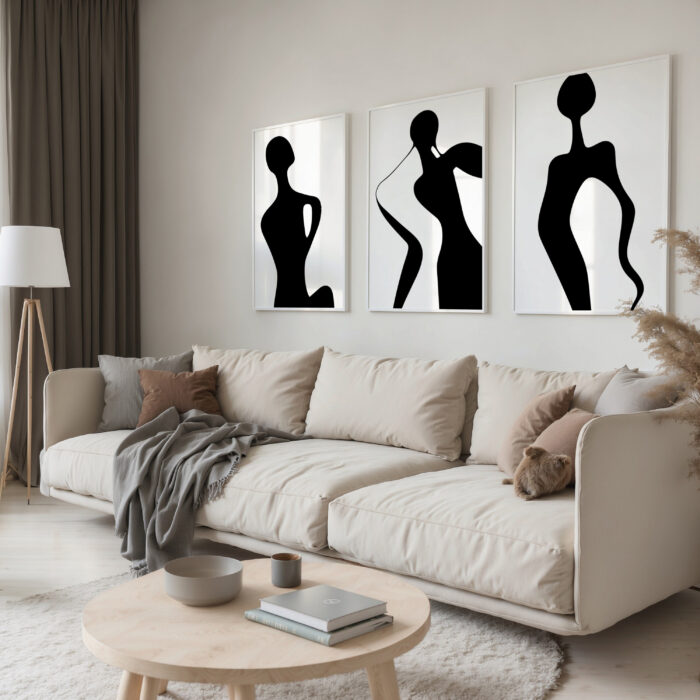 סט שלישיית תמונות של סילואט דמות אשה בשחור לבן: תוספת אמנותית ניטרלית לכל חדר. ציורים אבסטרקטיים מינימליסטים בהשראת ארט דקו, יוצרים מראה מונוכרומטי יפהפה שמתאים לכל סגנון. סט תמונות שהוא תוספת שיקית לסלון, לחדר השינה או לכל חלל בסגנון סקנדינבי שזקוק לטאצ׳ אמנותי . מתנה מושלמת לכל חובב אמנות – הזמינו עכשיו והוסיפו מגע של תחכום לבית שלכם!