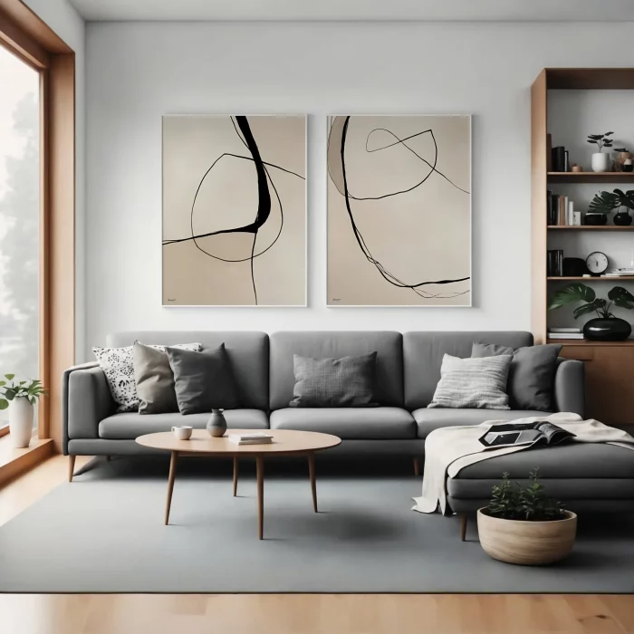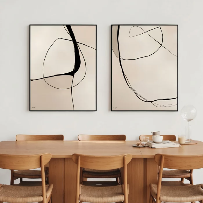 ציור אבסטרקטי מינימליסטי של קווים נקיים ומשיכות מברשת עדינות בגווני אדמה נייטרלים של שחור ובז׳. סט תמונות מקוריות המודפסות על קנבס או על נייר פיין ארט מקצועי בגדלים שונים לתליה על קיר הסלון או על כל חלל אחר שזקוק לנגיעה עיצובית. מושלם להדפסת תמונות גדולות ובינוניות במראה מודרני ועדכני. תוספת מרשימה של אמנות קיר מקורית לעיצוב הבית, וישתלב באופן מושלם עם מגוון סגנונות, מעיצוב קלאסי לעיצוב נורדי מודרני.