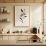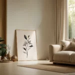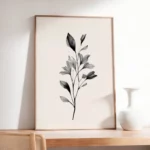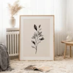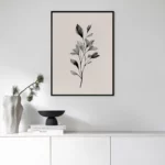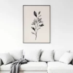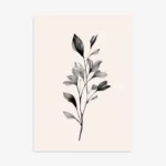 תמונה בוטנית אלגנטית ומינימליסטית. גבעול דק ועדין, המעוטר בעלים ובניצני פריחה, מתעורר לחיים באמצעות קווים שחורים דקים ומדויקים. השילוב בין קווים מלאים לבין הצללות עדינות מוסיף עומק וטקסטורה טבעית, ויחד עם הרקע בגוון בז’ רך וחמים נוצר מראה הרמוני המשדר רוגע ואלגנטיות טבעית. זוהי יצירה המשקפת את היופי שבפשטות, ומוסיפה לכל חלל תחושת שלווה מעודנת. מושלם עבור: