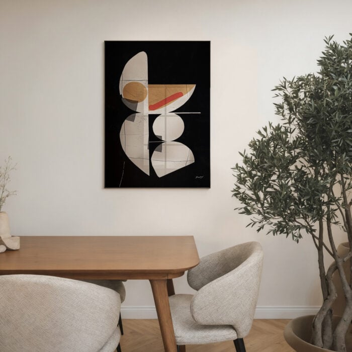 ציור אבסטרקט מינימליסטי עם צורות גיאומטריות בגווני בז׳ על רקע שחור. תמונה לבית המשלבת קווים נקיים וצורות מופשטות בהשראת האמנות המודרנית. יצירת אמנות מונוכרומטית מושלמת כתוספת עיצוב לבית בגווני אדמה ניטרליים. יצירת אמנות זו אינה רק תוספת ייחודית ומתוחכמת לכל חדר, אלא גם תשדרג את עיצוב הפנים שלכם ותעניק לו תחכום על זמני. בין אם אתם מחפשים תוספת עדינה לפינת הישיבה שלכם או יצירת אמנות מרכזית שתמלא את הקיר בסלון, ציור זה זמין במגוון גדלים כדי להתאים לצרכים שלכם. size סטנדרטי יעניק טאצ׳ אלגנטי לחלל קטן יותר, בעוד שתמונה גדולה תהפוך למוקד עניין עוצר נשימה בחלל מרווח. ציור זה מודפס על נייר איכותי ועמיד או על בד קנבס טבעי שיחזיק מעמד לאורך שנים.