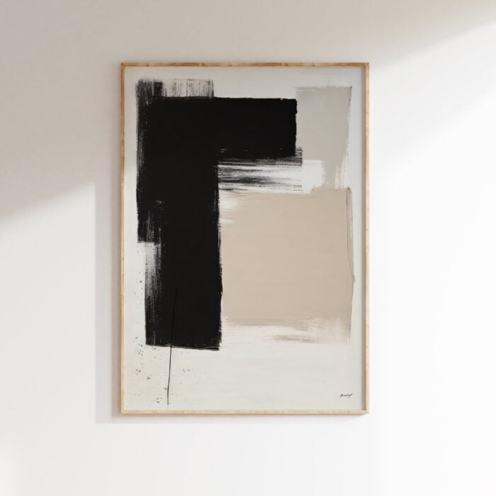 ציור מופשט אלגנטי זה עם גוונים אדמתה של שחור ובז’ וכולל משיכות מכחול דינמיות היוצרות איזון והרמוניה. תמונת קנבס אבסטרקט שחור בז’ זו מעניקה מגע אלגנטי ומינימליסטי המתאים לכל חלל בסגנון עיצוב מודרני. תמונה ניתנת להדפסה בגדלים שונים ומאפשרת לשלב אותה בקלות בעיצוב חלל הבית.