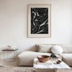 ציור עלים מינימליסטי ומודרני בסגנון קווים נקיים של שחור ובז’. תמונה נורדית ייחודית המציגה הדפס צמחייה מופשט בתמונה שחור לבן עם בסגנון ציור קו אחד. פוסטרים לבית מושלמים להוספת אלמנט טבעי ומינימליסטי לחלל הבית או המשרד.