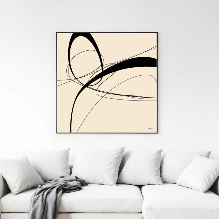 תמונה מינימליסטית בשחור בז׳ של ציור קו אבסטרקטי בפורמט ריבועי. קווים שחורים מופשטים ודינאמיים על רקע בז׳ בסגנון רישום קו פשוט ואלגנטי בסגנון אמנות מודרנית. יצירת אומנות שתוסיף טאצ׳ עיצובי עם תחכום ויצירתיות לכל חלל. הסגנון המינימליסטי והגוונים הניטרלים ישתלבו באופן מושלם בכל קיר בבית – בסלון, חדר שינה, פינת האוכל או במשרד. canvas או נייר פיין ארט במגוון גדלים להתאמה מושלמת לכל קיר.