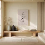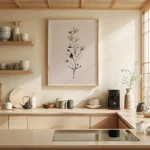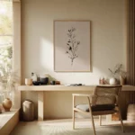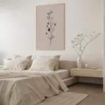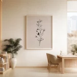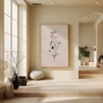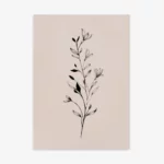 תמונה בוטנית מינימליסטית ומרשימה. גבעול דק מתנשא מעלה, מעוטר בעלים ובניצני פריחה שצוירו בקווים שחורים מדויקים ומלאי רכות. עבודת הקווים העדינה יוצרת ניגוד אלגנטי ומאוזן מול הרקע הבז’ החמים, ומדגישה את היופי הפשוט והאורגני שבצמיחה. היצירה משדרת רוגע, ניקיון ועידון – בחירה מושלמת לכל חלל המבקש לשלב טבע עם עיצוב מודרני ונקי.